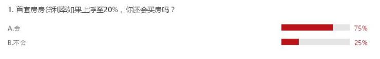 75%的网友认为,即便是首套房房贷利率上浮至20%也得买房,一方面是认为未来房贷利率还会有上涨的倾向,另一方面考虑到房价越来越高,首付比例越来越高,买房只能趁早。另一部分网友认为,房贷利率上调的目的,不外乎就是为了抑制不断上涨的房价,等房价稳定下来,利率自然是会下调,且这部分人群中还有一小部分人认为在楼市的调控强压下,房价会有下降的一天。
