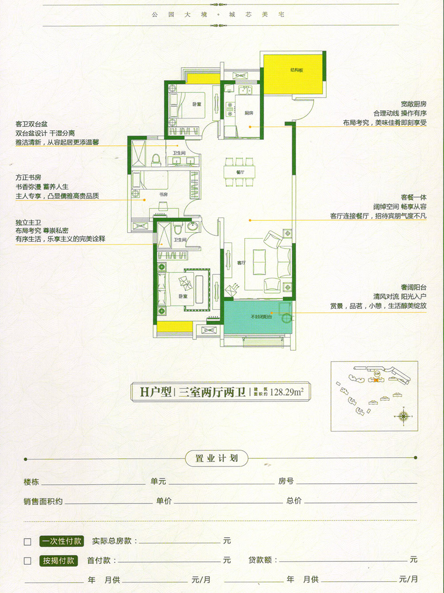 33号楼H户型128.29平米-3室2厅2卫-128.29㎡