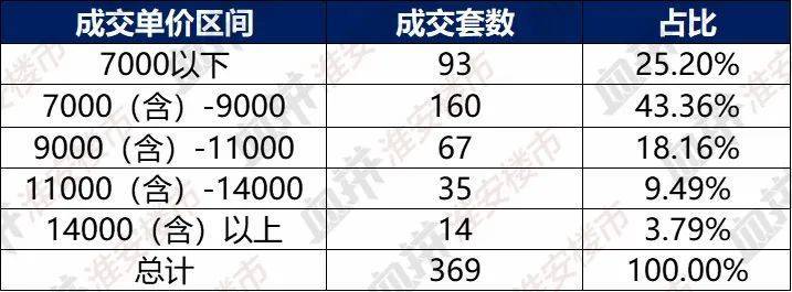 其中7000-9000元/㎡价格区间内,成交套数占比更是超过了4成。另外,单价7000以下房源的成交占比同样达到了,成交总量的1/4。