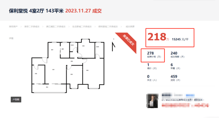 该房源是保利堂悦的一套洋房,虽然仅经历了一次调价,但房东一次却足足降了60万。足可见其诚意满满。