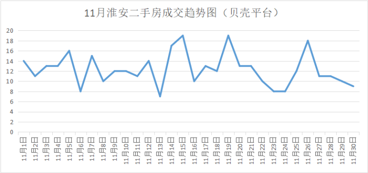 从日均成交数据看,11月淮安二手房成交量的上下波动十分明显,日均成交量约13套,而超过平均值的天数仅有8天。
