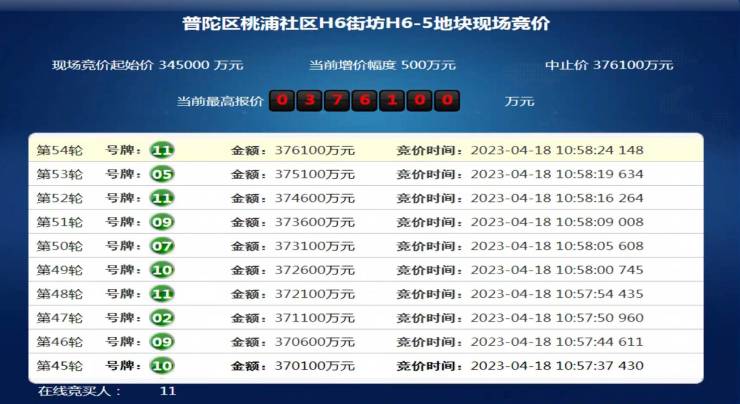普陀区桃浦社区H6街坊H6-5地块共吸引11组竞买人同时竞拍,该地块的出让面积为33997.6平方米,地块用途为普通商品房,地块范围东至规划祁顺路,南至规划H6-7地块,西至规划H6-4地块,北至规划连冠路。该地块起始价34.5亿元,现场经过54轮报价后,该地块触及中止价,最终由浙江省交投控股集团有限公司和象屿地产集团有限公司以37.78亿元竞得,溢价率9.51%。