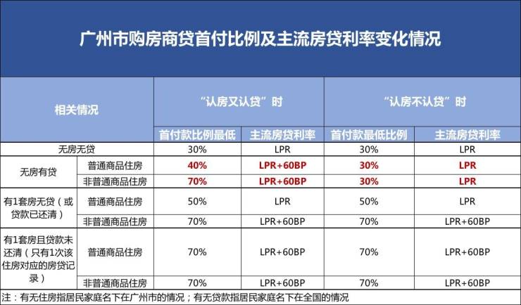 记者对比发现,最大的变化还是在于“无房有贷”的情况,新政之下,无房有贷的购房者,在广州购买普通商品住房,首付比例将从4成降至3成,房贷利率将从LPR+60降至LPR;购买非普通商品住房,首付比例将从7成降至3成,房贷利率将从LPR+60降至LPR。