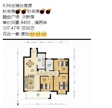 据了解,融创广场近日挂出了一套单价只需约8400元/㎡的房源,这套房源建面约107.47㎡,总价是90万,折合单价是8374元/㎡,约8400元/㎡。