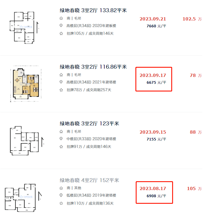 根据贝壳上的成交记录,绿地春晓的房价已经先运河风华一步跌破了7千,前两个月出现了2套单价6千多的成交房源。