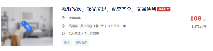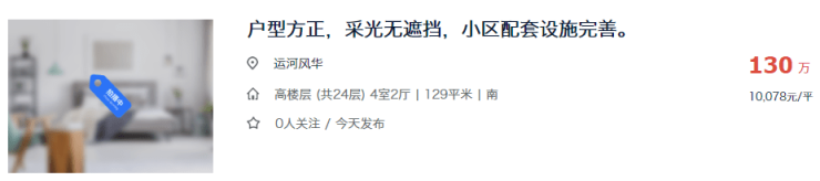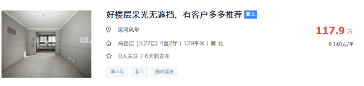 目前运河风华建面约129㎡的四房户型,挂牌单价一般在8300-10000元/㎡左右。