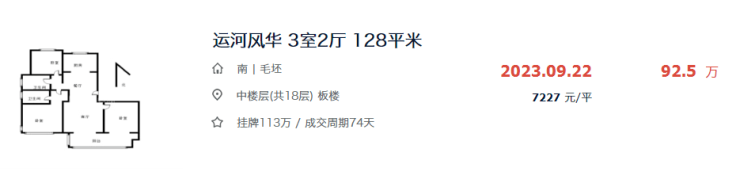 而运河风华迄今为止最低的成交价是7227元/㎡,如果该套房源成交,那么它将成为小区历史最低的成交房源,也会是第一套成交价跌破7千的房源。