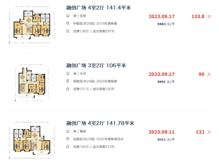 并且在9月份,融创广场也成交了一套单价8491元/㎡的房源!这套房源同样是该小区交付以来成交价最低一套房源!