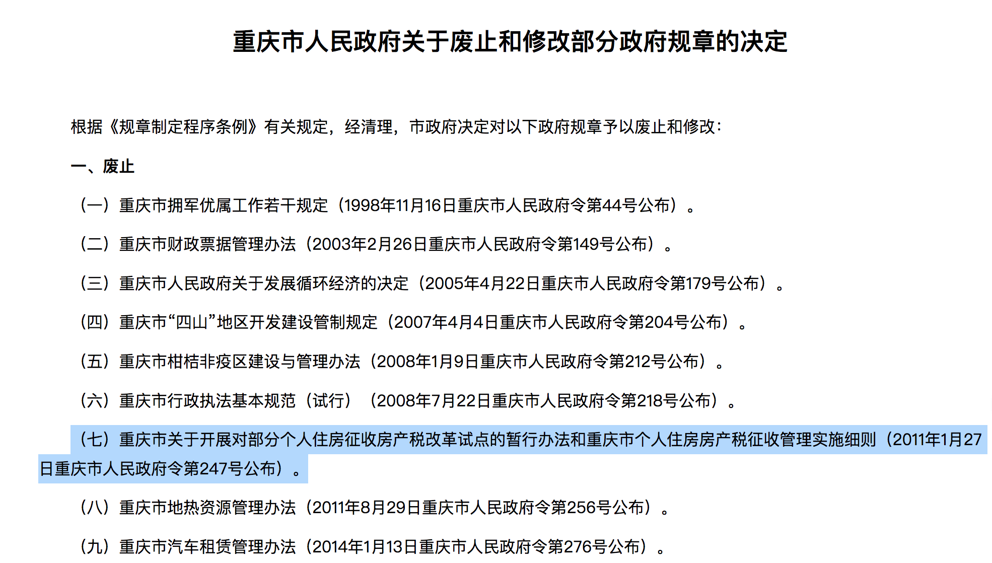 在九项予以废止的政府规章中,包括2011年1月27日重庆市人民政府令第247号公布的重庆市关于开展对部分个人住房征收房产税改革试点的暂行办法和重庆市个人住房房产税征收管理实施细则。