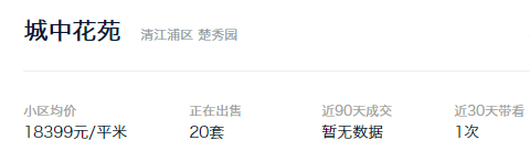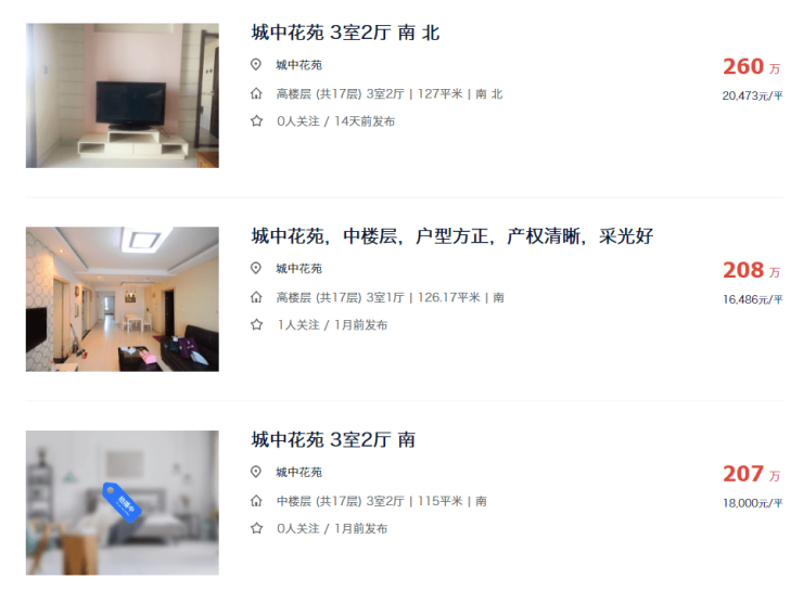而城中花苑的挂牌均价是18399元/㎡,该小区房源挂价偏高的房源也超过了2万/㎡。