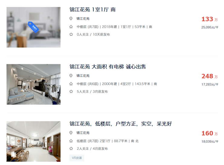锦江花苑目前在贝壳网上的挂牌均价是20691元/㎡,小区也有小户型房源的单价超过2.5万/㎡。