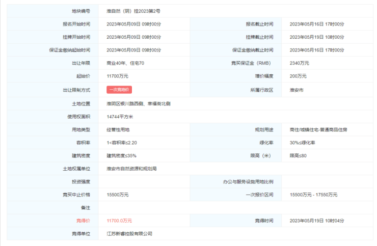 项目地块在今年5月19日被江苏新睿控股有限公司以1.17亿元的底价摘牌,地块楼面价3607元/㎡。