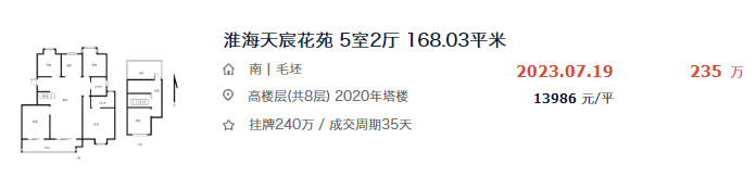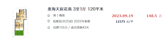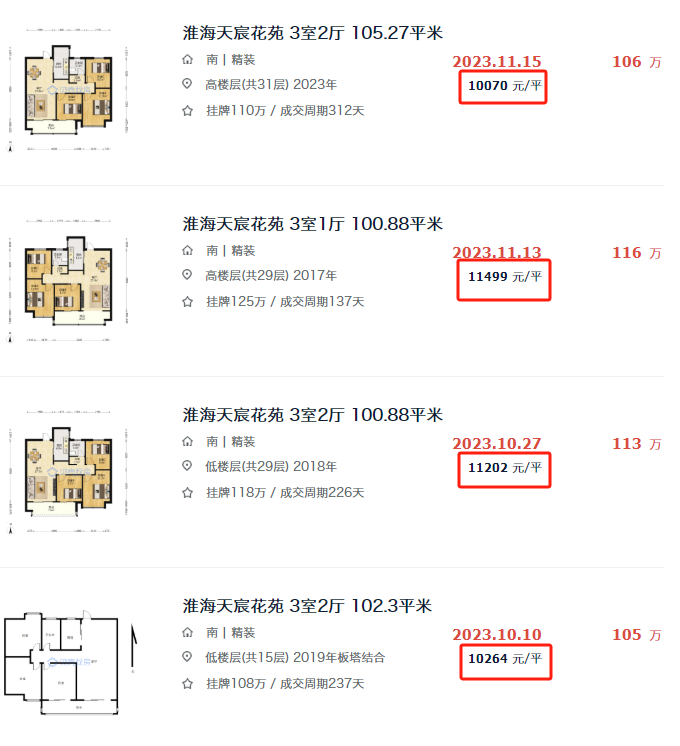 比如淮海天宸!该小区在去年年底交付,如今差不多刚好一年的时间,目前小区的二手房真实成交价保持在约1-1.1万元/㎡!