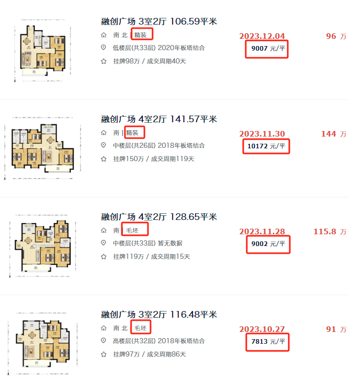在此之前融创广场已经交付了前期的很多房源,这两年也在经历着二手房市场的考验,如今“拷打”后的结果是: