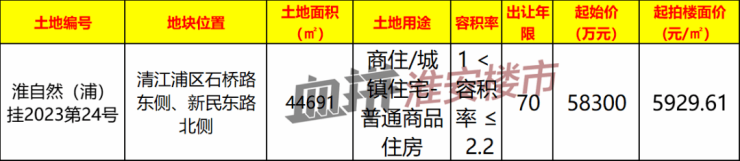 该地块位于清江浦区的清浦老城区板块,宗地供应面积44691㎡,起拍总价5.83亿元。