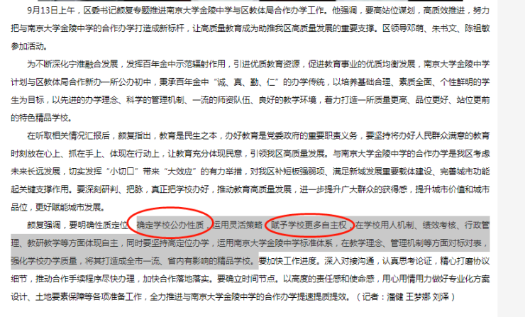 其中淮安区官方也曾重点提及:金陵中学淮安分校学校公办性质,办学中运用灵活策略,赋予学校更多自主权。