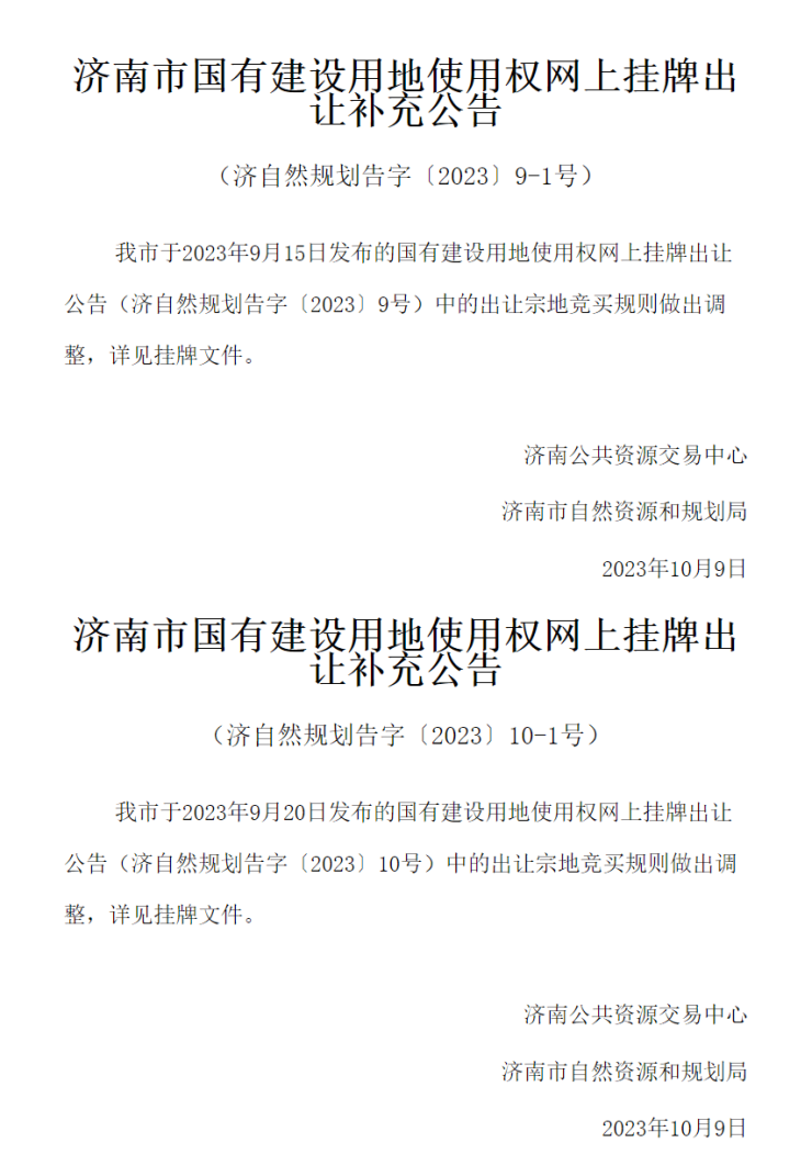 根据济南公共资源交易中心、济南市自然资源和规划局于10月9日发布的补充公告,济自然规划告字〔2023〕9号、济自然规划告字〔2023〕10号公告中的出让宗地竞买规则做出调整,详见挂牌文件。