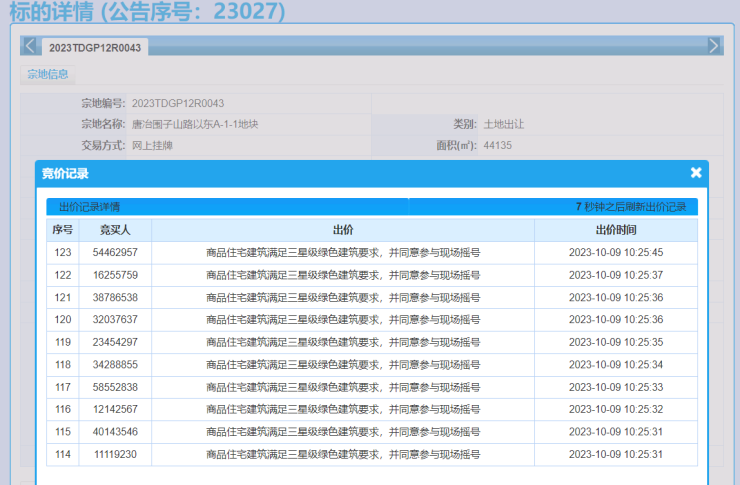 本批次地块中,位于历城区的唐冶围子山路以东A-1-1地块经过123轮竞价并触顶摇号。根据中指研究院监测数据,该地块共吸引有华润、中海、保利、瑞马、中建等12家房企参与竞争。最终该地块触顶地价上限4.874亿元及完成竞品质阶段,成交楼面价9203元/平方米,溢价14.9%,将进入现场摇号阶段,且12家房企均已给出商品住宅建筑满足三星级绿色建筑要求,并同意参与现场摇号。