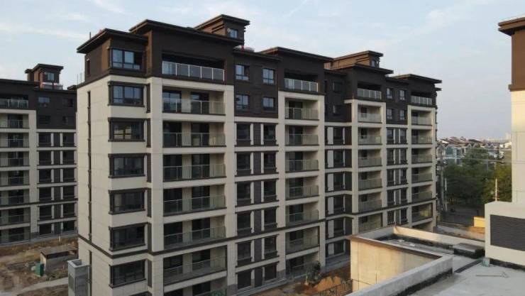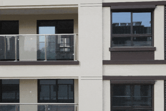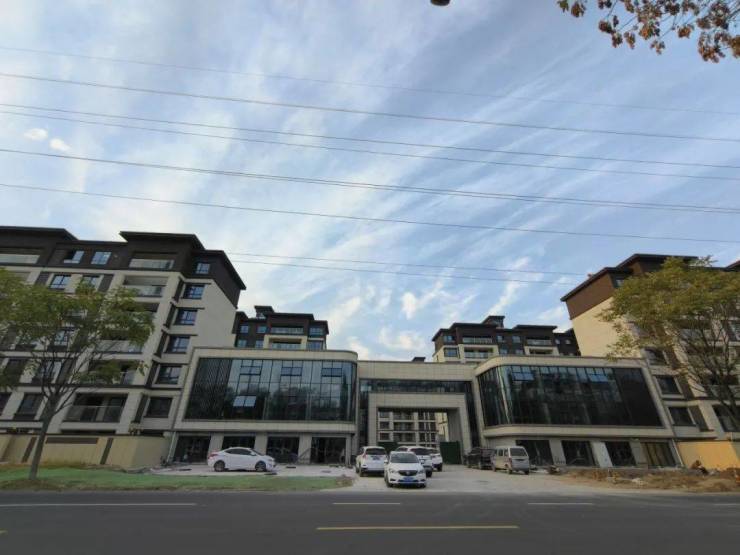小区的楼栋已经基本完工,外立面是米白色真石漆搭配深咖色的窗台和楼顶,很有质感。