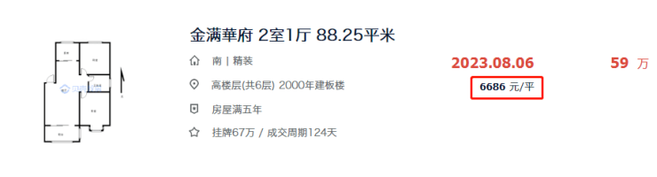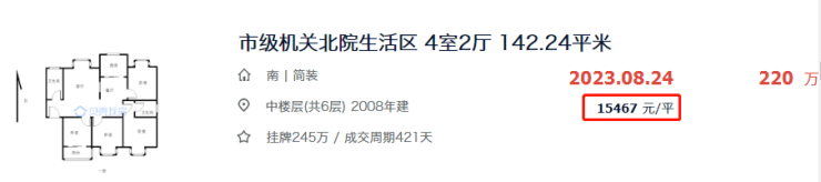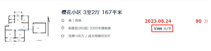 但在8月24日,小区成交了一套大户型房源,建面约167㎡,总成交价90万,成交单价只有5390元/㎡,低于6千每平。