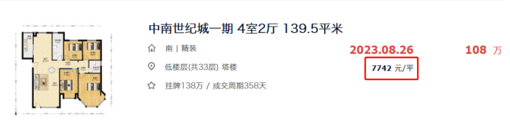 1.8月26日,生态新城西片区中南世纪城一期,成交了一套建面约139.5㎡的高层,成交总价108万,折合单价仅为7742元/㎡,单价低于8千!