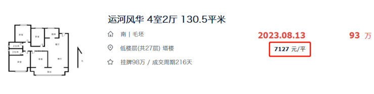 在8月13日,运河风华成交了一套建面约130.5㎡的房源,成交总价93万,成交单价仅为7127元/㎡。