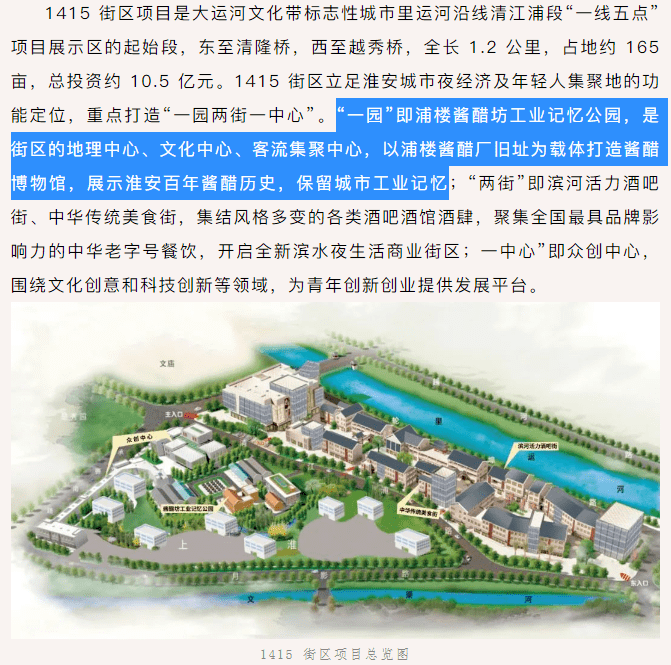 据运河之都百里画廊微信推文介绍,该地块属于清江浦区1415 街区项目内,预计将打造楼酱醋坊工业记忆公园,形成富有特色的商业街。