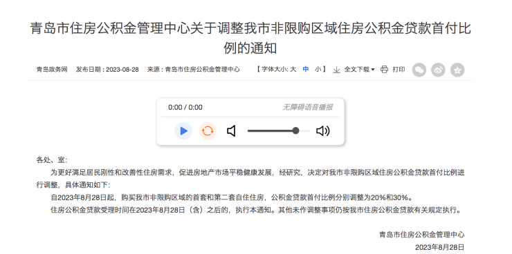 8月28日,山东省青岛市住房公积金管理中心发布《关于调整我市非限购区域住房公积金贷款首付比例的通知》,《通知》指出,为更好满足居民刚性和改善性住房需求,促进房地产市场平稳健康发展,决定对青岛市非限购区域住房公积金贷款首付比例进行调整。