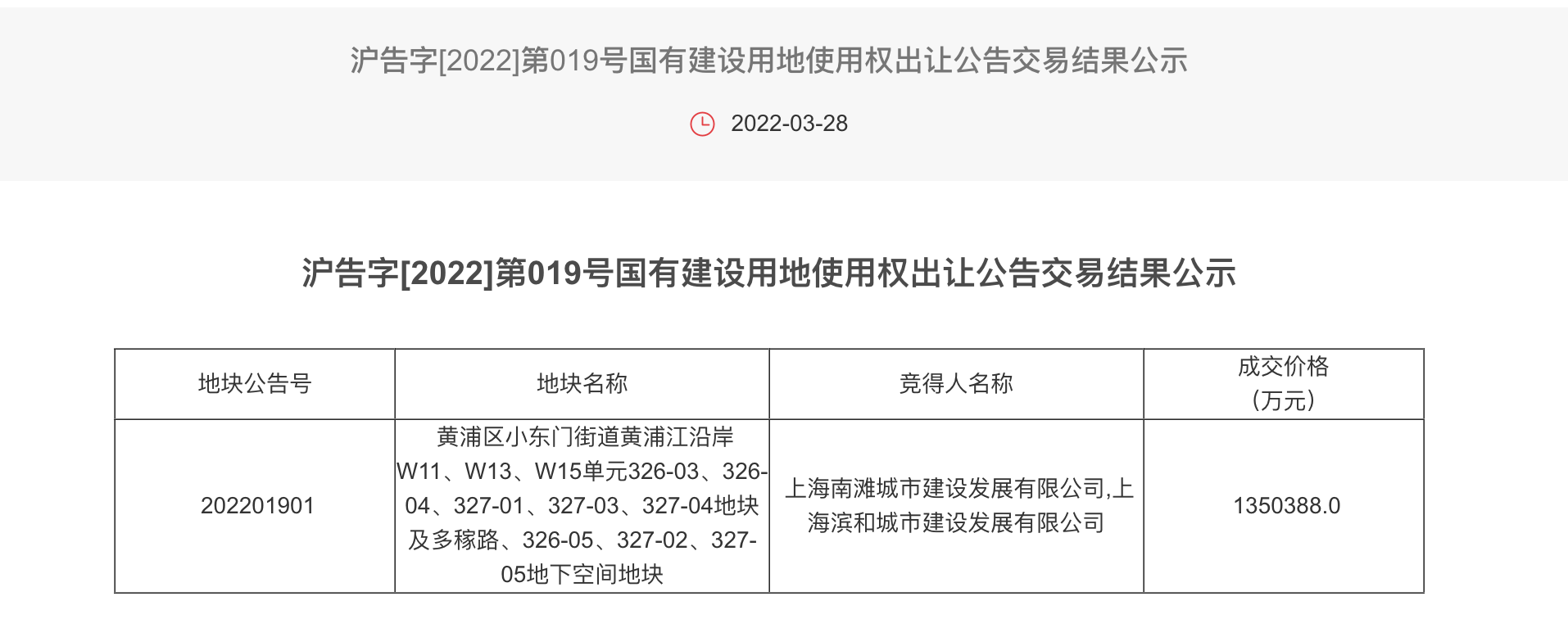 3月28日,上海土地市场官网显示,“黄浦区小东门街道黄浦江沿岸W11、W13、W15单元326-03、326-04、327-01、327-03、327-04地块及多稼路、326-05、327-02、327-05地下空间地块”成功出让,成交价格为135.0388亿元,竞得人为上海南滩城市建设发展有限公司及上海滨和城市建设发展有限公司。