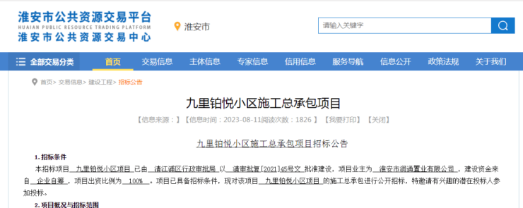 比如说,位于清浦老城区的九里铂悦项目施工总承包招标便在最近公示。