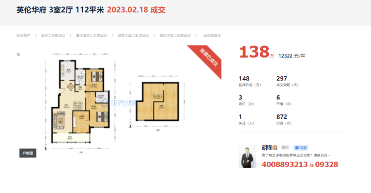 初始挂价148万,经过1次调价之后,最终成交价138万,折合单价,12322元/㎡。