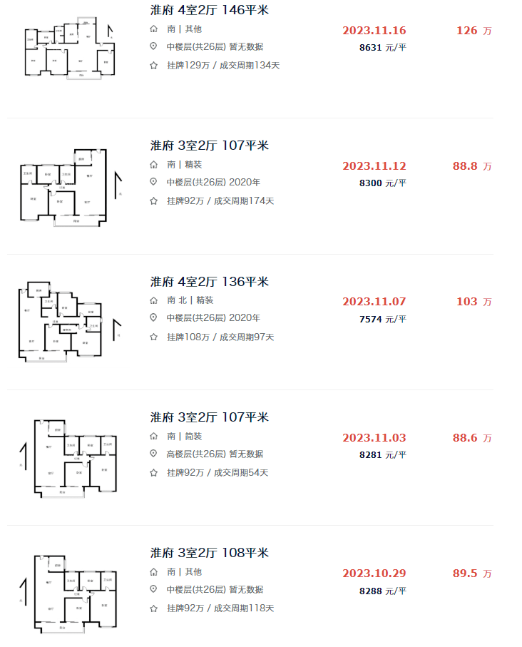 还有同板块去年底交付的次新小区淮府,位置和交付品质都要优于水沐未来城,目前的挂牌均价是10406元/㎡,而真实的高层成交价基本都在8千多。