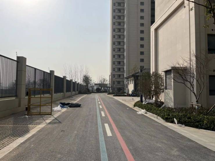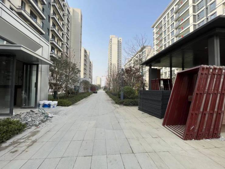 小区中来往有很多工人还在忙碌,还有不少建筑器材摆放在路上。