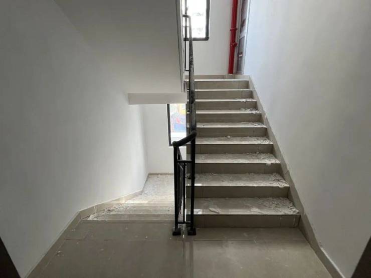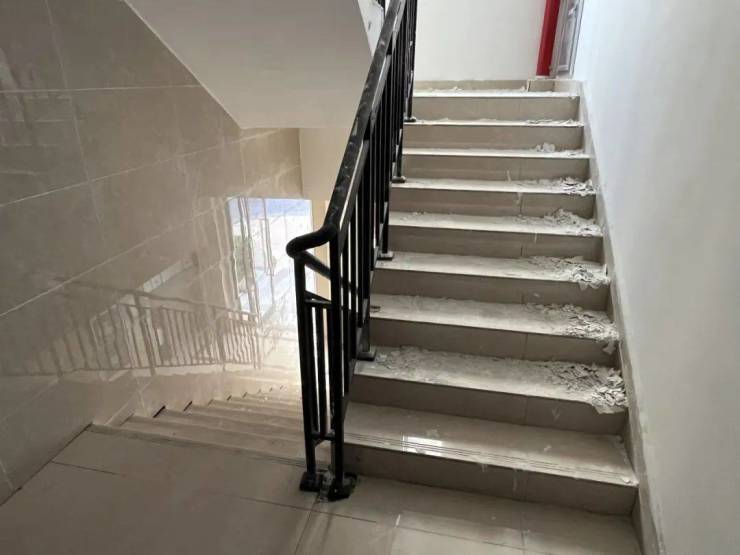 甚至洋房楼梯间墙面因为回潮起泡严重,目前工人正在铲掉,准备重新粉刷,地面上有很多墙皮碎屑。