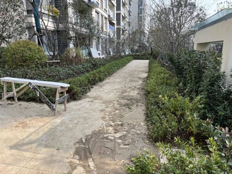 绿化是刚刚种植的,在浇水后留下大量泥沙,目前还未清理。