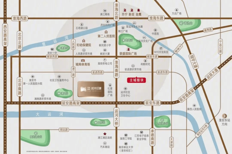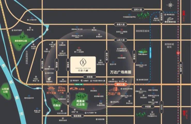 两条轴线恰恰分别代表了淮安区老城及新城的发展方向。而中轴之上的中海九樾正处在城市主流生活圈的腹地。