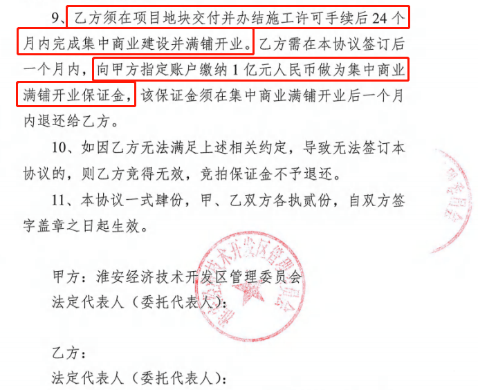 因为根据该项目地块《投资发展监管协议》第九条显示:乙方须在项目地块交付并办结施工许可手续后 24 个月内完成集中商业建设并满铺开业。