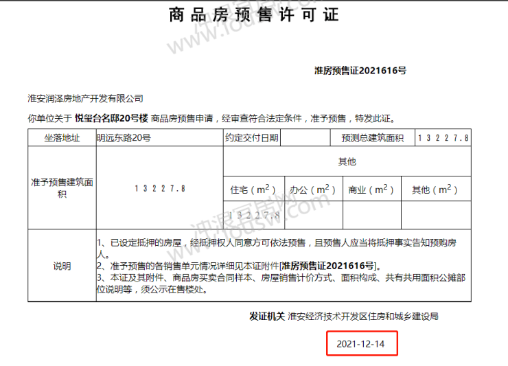 根据淮安网上楼市显示,悦玺台名邸的首张预售证20号楼是于2021年12月14日获得,这足以说明地块当时或者在此之前已获得施工许可证,才能够正式施工。