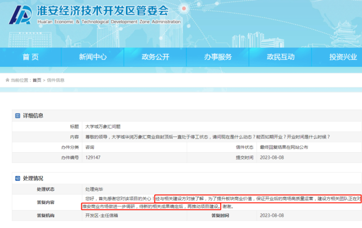 得到的答复内容为:“经与相关建设方对接了解,为了提升板块商业价值,保证开业后的商场高质量运营,建设方相关团队正在淮安商业市场做进一步调研,待新的相关成果确定后,再推动项目建设”。
