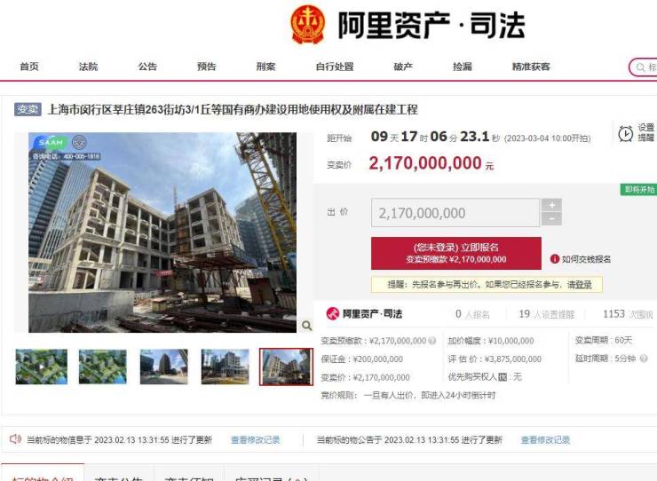 2月22日,据阿里拍卖网消息,上海市闵行区莘庄镇263街坊3/1丘等国有商办建设用地使用权及附属在建工程将于3月4日开拍变卖,变卖价格21.7亿元。