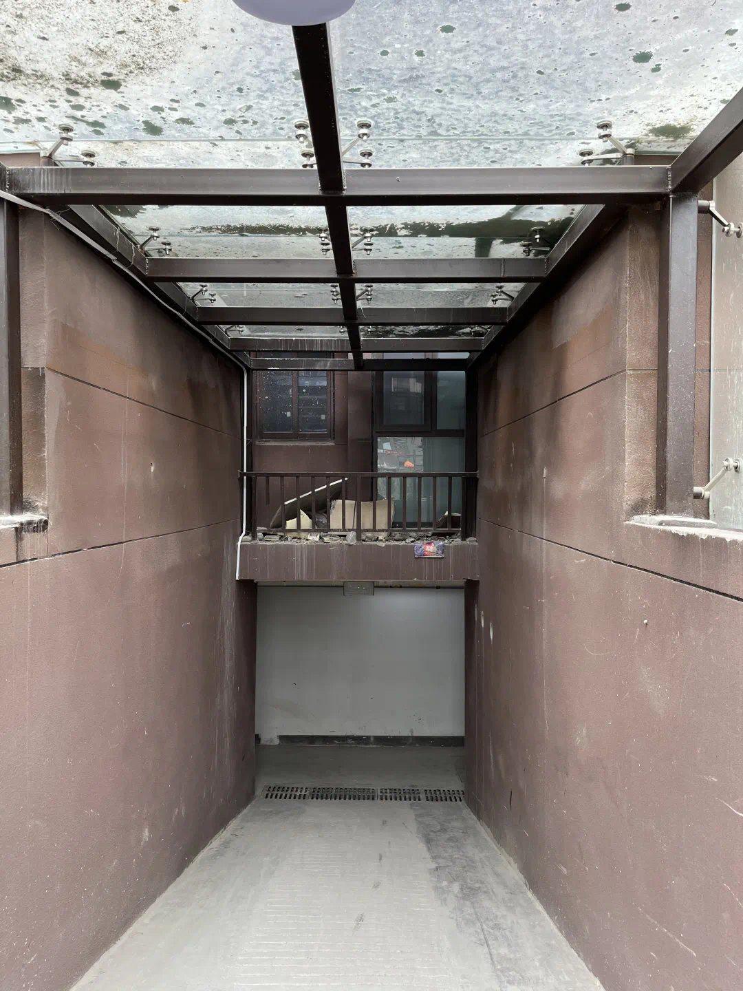 进入车库的地下通道,无论是地下、墙体还是天窗,全都是污渍。