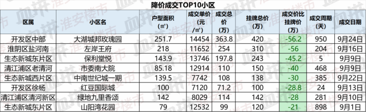 此外,在9月的成交房源中,降价成交的房源313个,占比高达95%,其中降的最狠的一套房源成交价足足比挂牌价便宜了56.2万元。