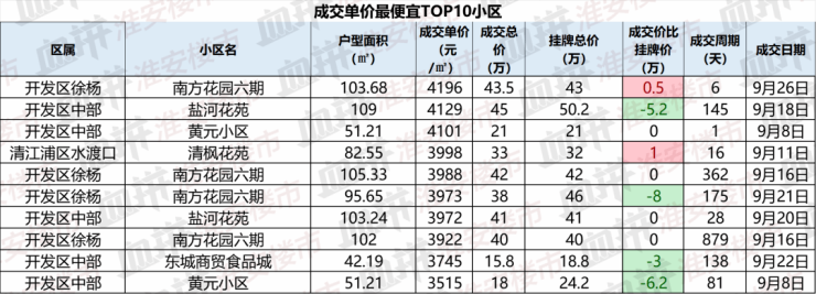 据梳理,最新数据显示,9月卖得单价最低的一套房源,是位于开发区中部的黄元小区,房源单价仅3515元/㎡。