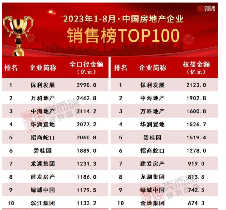 8月31日,克而瑞地产研究中心发布今年前8个月房地产企业销售TOP100销售情况。