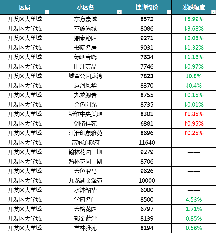 大学城的二手房行情依然处于较为低迷的状态,一共统计了23个小区,15个下跌,4个上涨,7个保持不变。