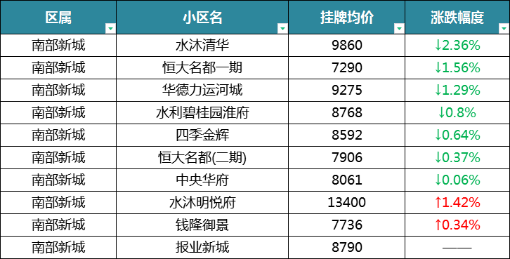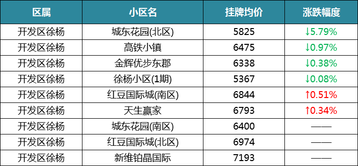 在徐杨板块,活跃的二手房小区较少,目前只统计了9个小区,4个下跌,2个上涨,3个下跌。