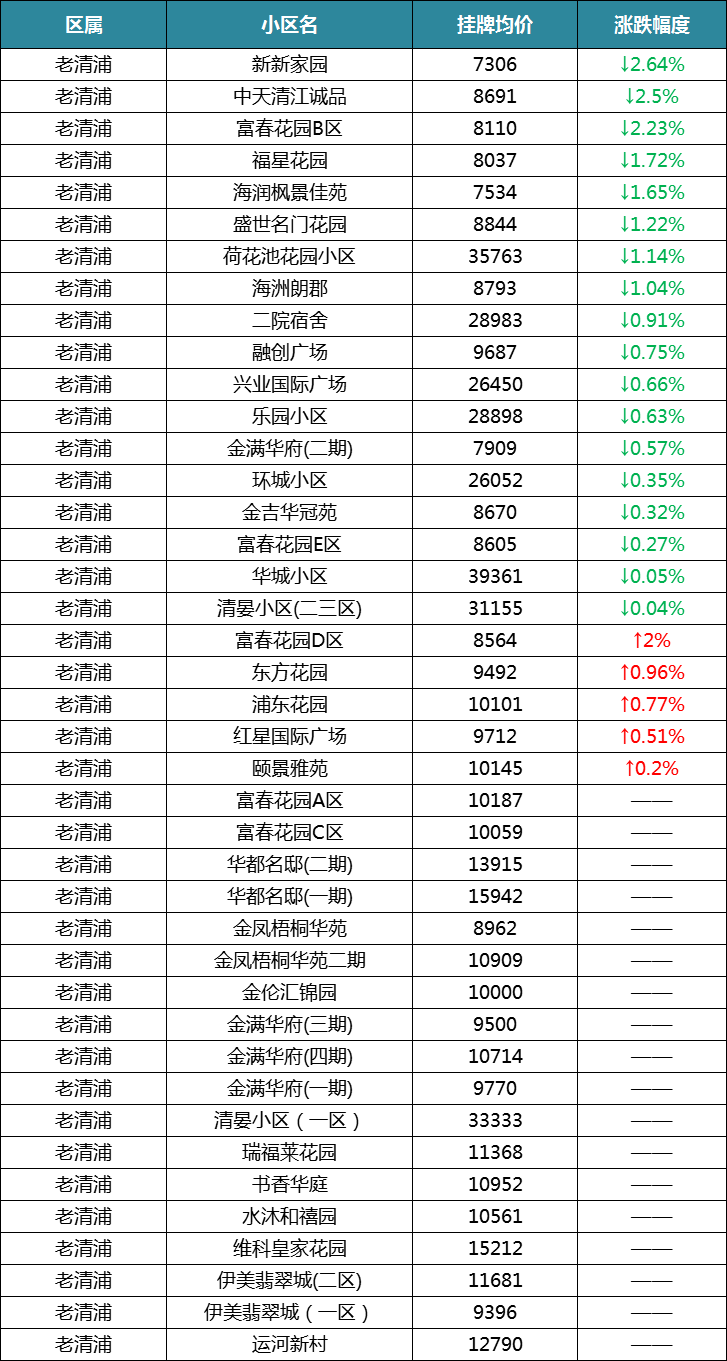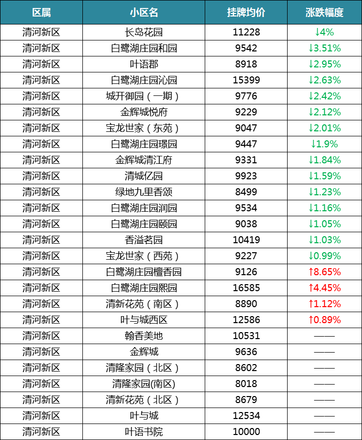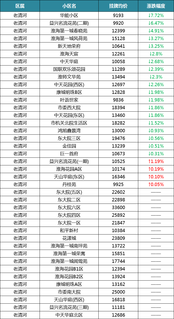 老清河板块统计了40个小区,19个下跌,4个上涨,17个保持不变。