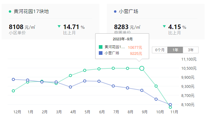 该小区也是从9月份开始陡然的下降,降势很猛,9月挂牌均价还是10677元/㎡,11月份却是8108元/㎡。