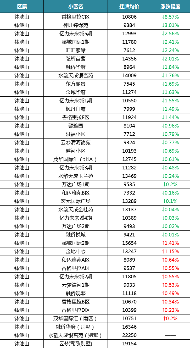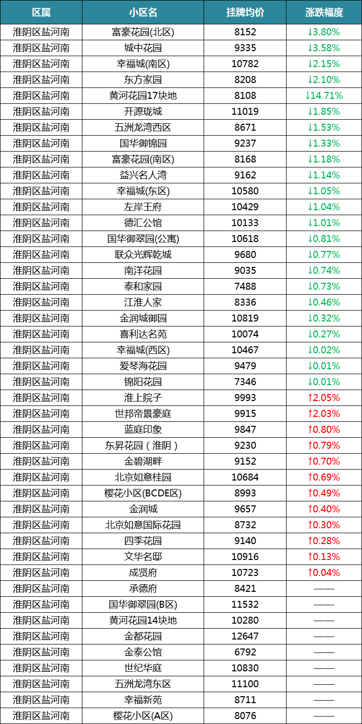 再来看淮阴区盐河北,一共统计了32个小区,19个下跌,5个上涨,8个保持不变。