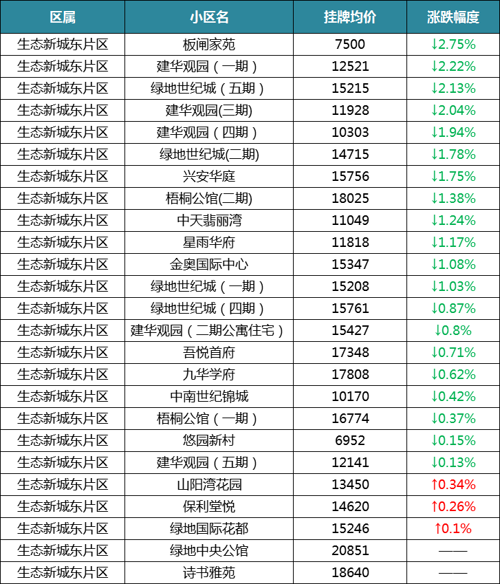 东片区只有3个小区上涨,其余小区均是下跌或不变。